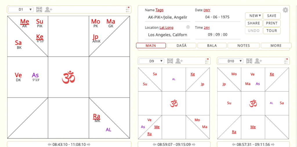 The lords of trine houses, AS – 1st (Moon), 5th (Mars / Ketu) and 9th (Jupiter / Ketu) are always considered to be auspicious. Angeline’s Jupiter placed in a trine aspects all the other trines makes it extremely auspicious. The Navamsa Chart (D9) and Dasamsa Chart (D10) indicate skills associated with Venus: the arts, acting, music and dance. A few significations for Moon: personality and social consciousness; Mars: the planet of power, strength, courage and aggression; Jupiter: domains of principle as law, religion and philosophy.