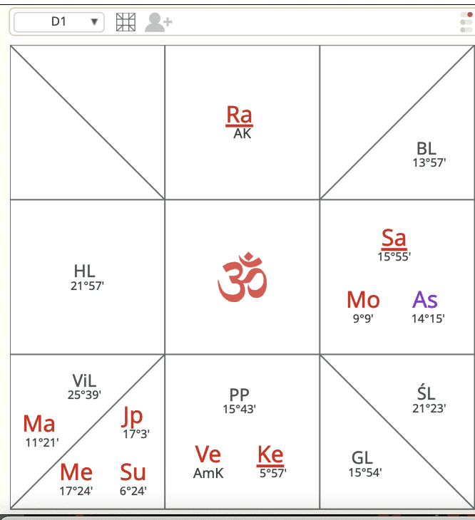Saturn retrograde is extremely strong and demands that Gustav had to try, try and try again to achieve success. It conjoins the Moon in the ascendant and indicates an unfriendly combination; Saturn a (tamasic) planet – arise from ignorance and slow moving with a (sattvic) planet – having a serene, harmonious balanced mind or attitude and fast moving. Therefore, effort was necessary to focus and steady his fluctuating mind at times throughout creative projects. Furthermore, Saturn and Moon are both (maraka) planets – harmful to health, wellbeing and longevity, as they lord the 1st house of Capricorn, 2nd house of Aquarius and 7th house of Cancer. The drinking of alcohol and taking drugs of any kind, would greatly impact Gustav’s mental state and intellectual mind and take health from his body. Maybe, that is why Gustav was teetotal and a vegetarian with spiritual insight to abstain from substances that would, if over consumed, weigh down his body and dull his intellect and musical talent.